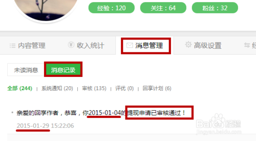 6、最后我们只需要耐心等待,审核通过后,系统会提示你,我们来看看大概需要花多长时间,在“消息管理”界面可以看到,1.4--1.29,大概一个月的时间,所以我们需要耐心等候