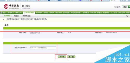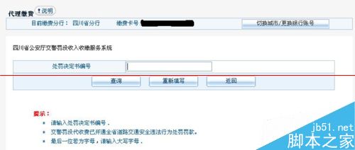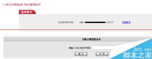 2、选择“代收交警罚款业务”,选择卡号,输入决定书编号