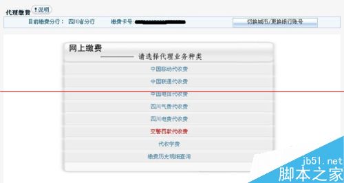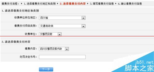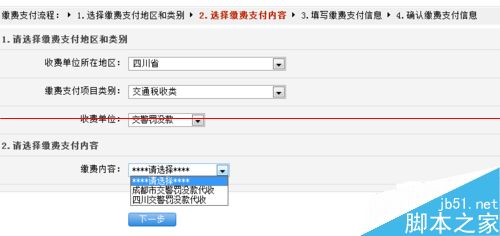 3、选择缴费支付内容,选择“四川交通罚没款代收“