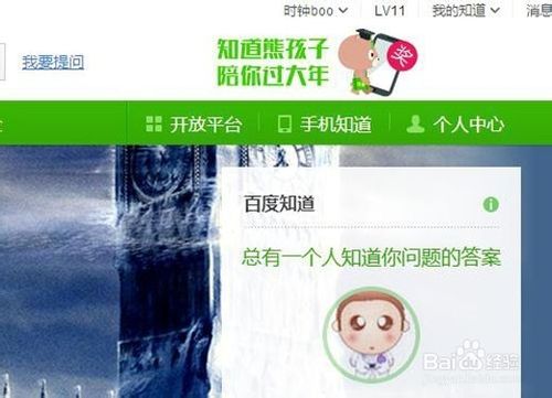 1、首先打开百度经验首页,下拉到如图1的位置,点击“知道熊孩子陪你过大年”图片,或是如图2,打开“百度知道”首页,点击右面的“知道熊孩子陪你过大年”!