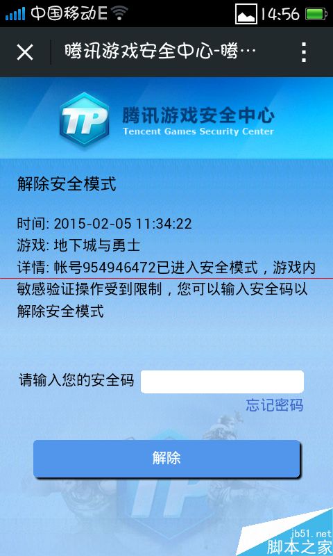 14、输入刚才设置的腾讯安全中心安全码,成功免费解除安全模式。