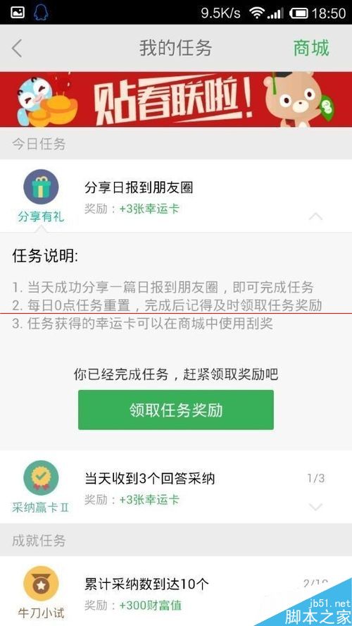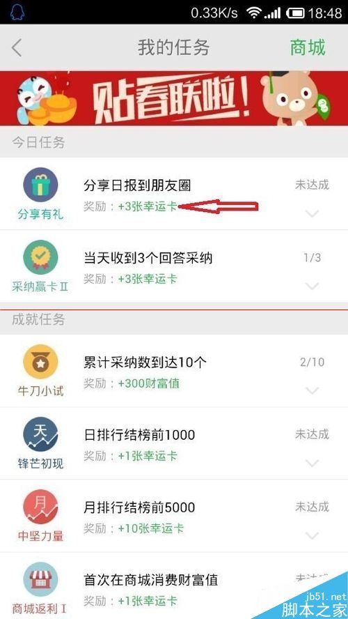 3、然后进入任务栏目。我们可以看到每个任务的下方都会有相应的幸运卡奖励,完成任务即可获得。