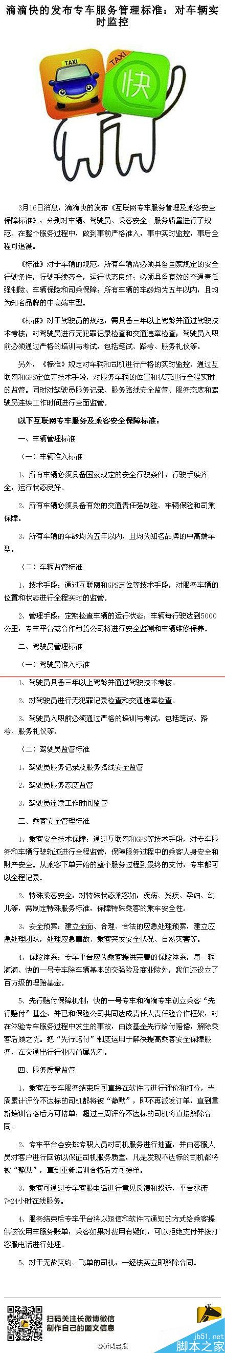 今日,滴滴快的发布《互联网专车服务管理及乘客安全保障标准》,分别对车辆、驾驶员、乘客安全、服务质量进行规范。其中车辆要求是五年内的中高端车,司机满3年驾龄。