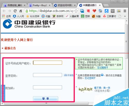 2、输入证件号、密码和附加码后点击登录进入个人网银界面。