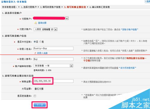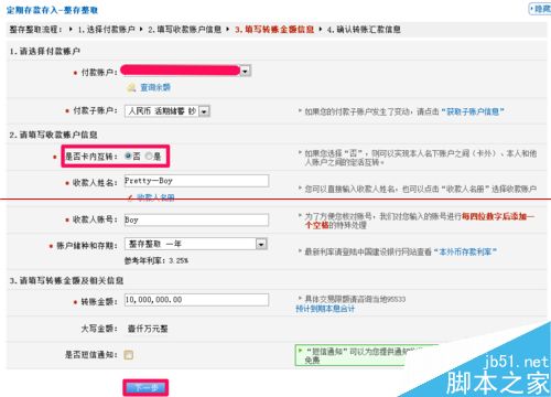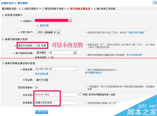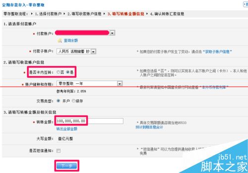 2、首先选择付款账户后,可以选择是否卡内互转(你可以用开通网银的卡办理定期存款到其它账户,也可以直接在现有账户中办理定期存款)。然后输入收款人姓名、帐号以及转账金额等,最后单击下一步就可以了。