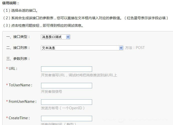 接口列表中选择自己要调试的类型,这里以 文本消息 为例