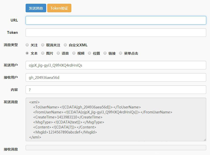 选择消息类型,例如“文本”,将列出该消息类型的各项参数,在各项参数中填入要发送的参数内容,然后点击“发送消息”按钮。