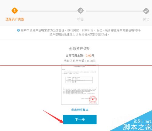 5、在资产证明页面,首先可以找到一个样本,我们直接点击下一步开始开具证明。