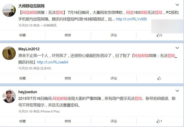 网易方面称:“由于系统升级,自7月16日晚起,部分网易免费邮箱和vip邮箱用户出现无法正常登录的情况,网易技术人员已于17日凌晨成功修复,请用户放心,邮件信息存储和邮箱账号安全未受任何影响。”