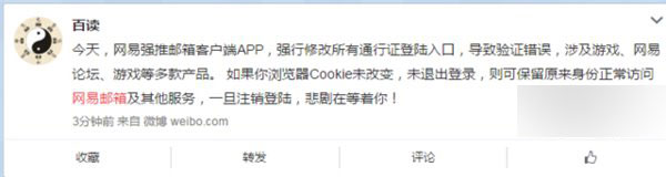 然而,据网友反映,出现故障的不仅仅是网易邮箱产品,网易旗下的其它产品例如网易游戏也出现了账号无法登陆现象,但无法确认是否为个例。值得注意的是,有网友爆料称,此次故障的原因是“网易强推邮箱客户端APP,强行修改所有通行证登陆入口,导致验证错误,涉及游戏、网易论坛、游戏等多款产品。”但无法证实该网友的说法是否正确。