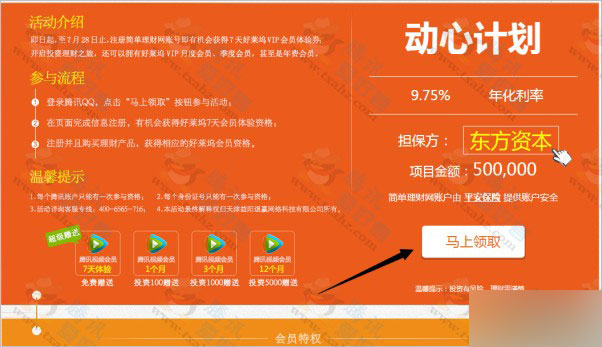 1、打开活动地址 http://jiandanlicai.act.qq.com/,登录QQ号后 点击“马上领取”