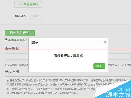 1、最近新装的一台电脑,浏览器用的IE10,升到到了最新补丁,结果在写经验过程中出现无法保存的现象,报错为服务器繁忙,请重试,如下图所示。