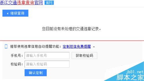 5、系统还非常人性化的帮助我们设置了“免费短信提醒功能”,选择屏幕上的“定制短信免费提醒”系统会出现输入手机号码和验证码的提示框,我们输入手机号码后,点击“获取校验码”,系统就会发送信息到我们手机,输入校验码后就可以提交了,以后有违章信息,系统就会发免费短信提醒您了。