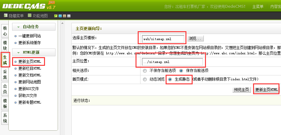 打开织梦网站后台—生成—更新网站主页,按照下图示范进行更新,你可以直接把index.htm更换为sitemap.xml就可以了,然后选择生成静态进行更新,更新完整后就会在网站的根目录生成一个sitemap.xml的文件,测试是否可以访问,如果可以正常访问,再把更新主页那里的sitemap.xml更换为index.xml,重新更新一下首页。(如图)
