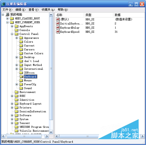 在弹出的“注册表编辑器”中,依次选择HKEY_CURRENT_USER——>Control Panel——>Keyboard