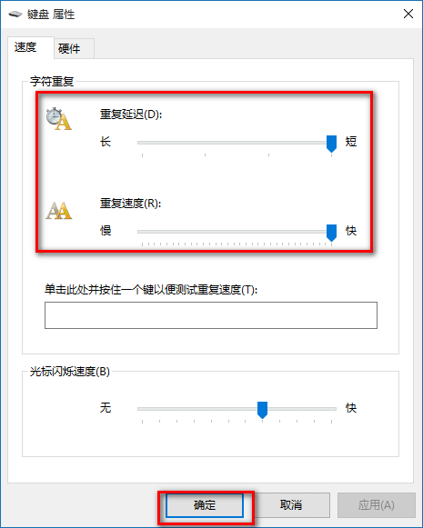 在打开的键盘属性窗口,在字符重复栏,把重复延迟(D)的滑块拉到最短位置,把重复速度(R)的滑块拉到最快位置(如图),然后点击:确定。