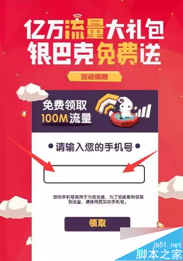 银巴克亿万流量免费送活动,非常简单领取100M流量,输入手机号码就可以领取,无需其他操作。大家只要按照下面的方法去领取流量就好了。下面就为大家介绍操作流程,不会的朋友可以参考一下哦!