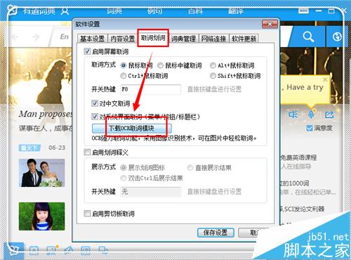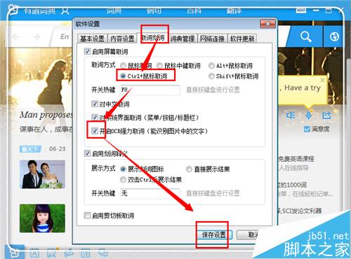 5、这时候再次进入迟点设置中,点击“取词划词”,然后将选择取词方式“ctrl+鼠标取词”(当然也可以是其他方式,只是这个更方便),将“开启OCR强力取词”前面的勾勾上,然后点击“保存设置”。