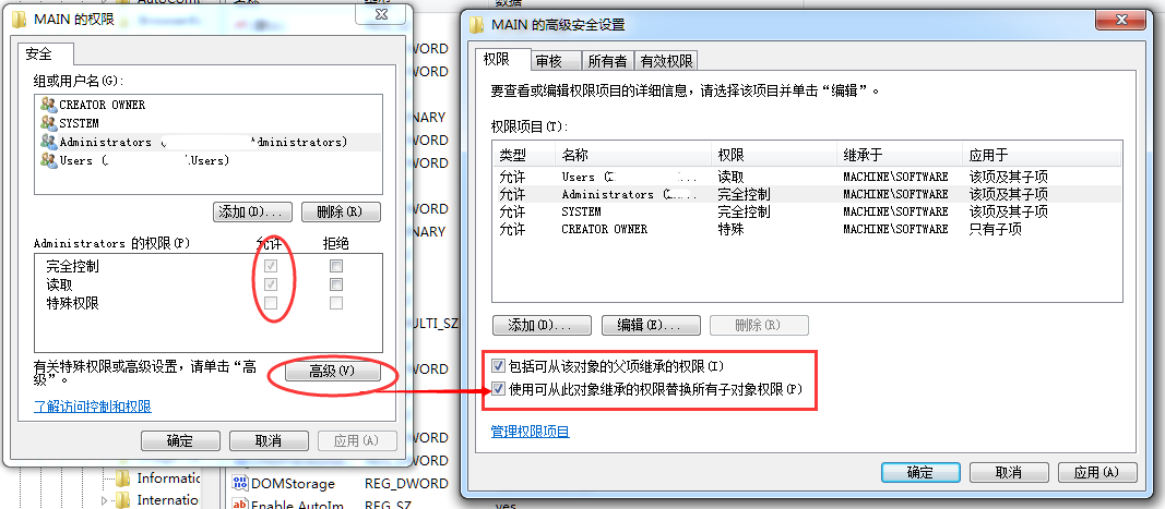 2、将当前用添加“完全控制”权限,并且点击“高级”,选中当前用户,将底部“包括可从该对象的父项继承权限”勾选,确定,退出注册表编辑