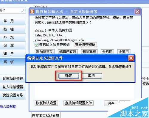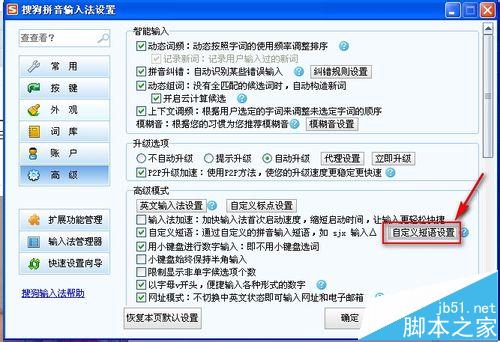 4、在“高级”栏里,我们选到右侧的“自定义短语设置”。