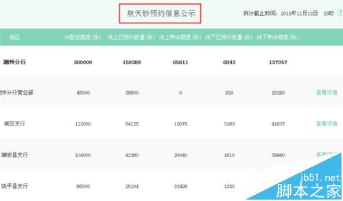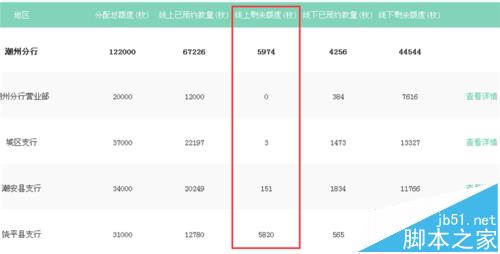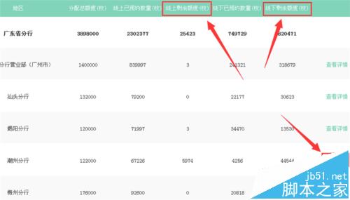 5、信息公示界面可以看到各个省份线上预约剩余的名额,我们点击广东省分行后方的查看详情;