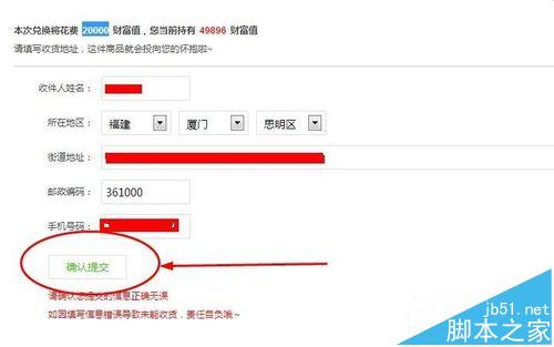 6、进入到收礼品的信息填写页面,填好我们的地址和联系方式,然后确认没有问题的话,点击确认提交。然后等待礼品邮寄过来签收下就可以拿到钱包了。