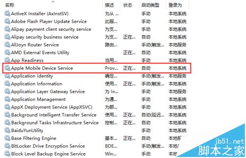 5、这时,我们将可以看到所有的服务栏目下的应用列表,找到一个名为“Apple Mobile Device Service”的栏目,双击打开