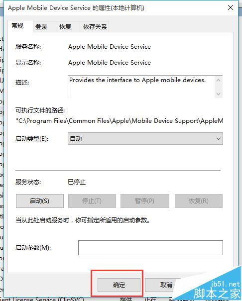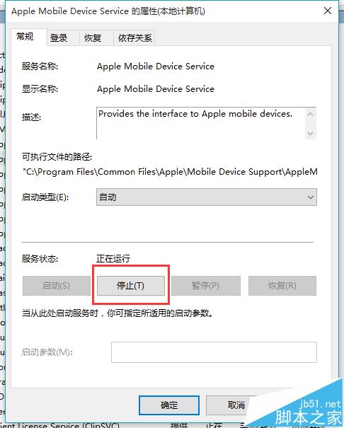 6、进入Apple Mobile Device Service属性设置页面,在“常规”栏目下可以看到“服务状态”目前处于正在运行,点击下方的“停止”按钮