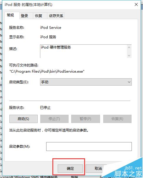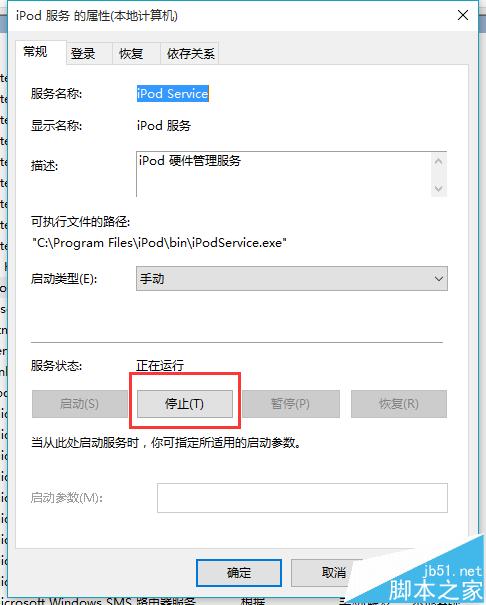 9、在打开的iPod服务属性设置页面中,同样,在常规栏目下把服务状态进行“停止”处理