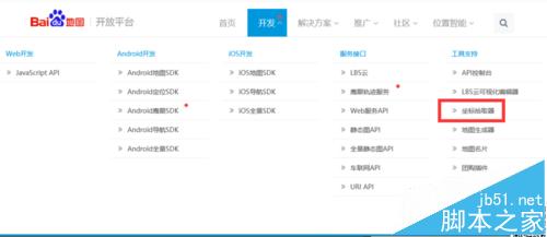 3、在开放平台页面中,鼠标指针停留在【开发】菜单,点击左侧【工具支持】→【坐标拾取器】