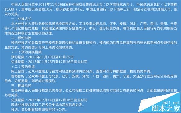 此次航天币、航天钞采取预约发行(网上预约和现场预约发行)和现场发行方式发行。现场发行从12月14日至16日,兑换银行有:农行、中行、建行、交行、招商银行、光大银行、兴业银行、浦发银行、中信银行、华夏银行、民生银行、邮储银行、农商银行、盛京银行、广发银行、平安银行等31家银行312个网点。