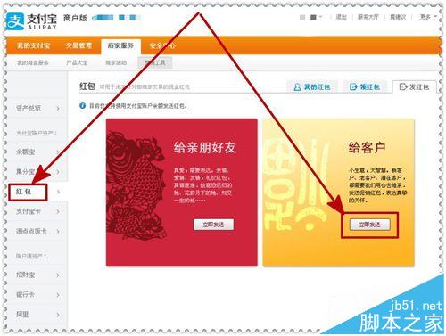 1、登陆支付宝商家版后,找到菜单上的“商家服务”点击打开,进入如下页面,找到菜单左侧的“红包”按钮,打开进入后找到给客户,点击”立即发送“进入下一步操作,如下图示。