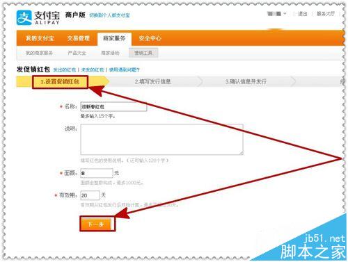 2、进入如下页面,进行”设置促销红包“界面,进行名称、面额、有效期的设置后,点击”下一步“进入下面操作,如下图示。