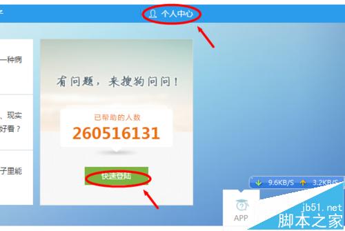 2、这是搜狗问问的首页,在右上边有个“个人中心”和下面有个“快速登录”点击就可以登录。如果你已经登录那点击上面的“个人中心”就可以直接进入。