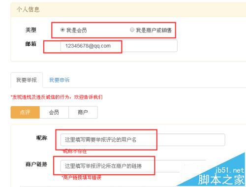 6、打开“诚信举报投诉”就进入了诚信举报投诉页面,在“个人信息”处选择自己的身份,然后填写接收投诉信息结果的邮箱,到下边的“我要举报”栏目下填写第四步中的昵称以及商户地址;