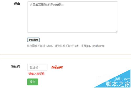 7、然后在“理由”中填写申请删除该评论的原因,填写完成后可以选择上传图片证明,最后输入验证码点击提交;