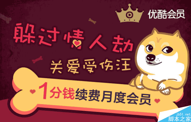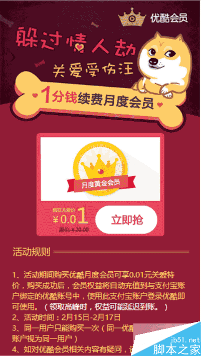 优酷会员关爱单身汪 一分钱抢一月会员 活动时间:2月15日-2月17日活动期间购买优酷月度会员可享0.01元关爱特价,购买成功后,会员权益将自动充值到与支付宝账户绑定的优酷账号中,使用此支付宝账户登录优酷即可使用,脚本之家的小伙伴们快来参与吧!