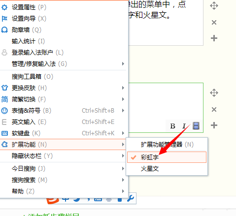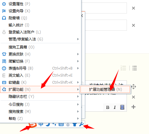 1、要输入火星文和彩虹字,首先要在搜狗输入法中添加扩展功能。右键单击输入法状态条右侧的小扳手按钮或者左侧的“s”图标,然后在弹出的快捷菜单中选择“扩展功能”,在下一级菜单中选择“扩展功能管理器”。