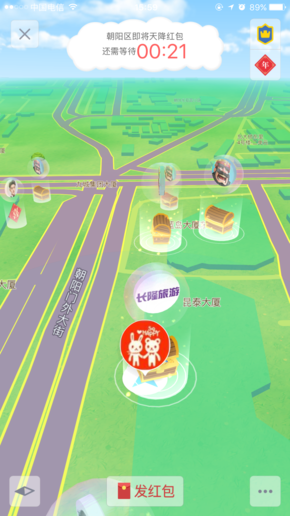 QQ将红包入口安排在了聊天列表界面,只要下拉即可进入红包地图,点击即有机会领取。不过领取的方式很有意思,点击红包后手机摄像头将自动开启,此时财神将从天而降出现在手机屏幕上,只要猜对钱在三个红包中的正确位置就能将它领走,像做游戏一样非常有趣。