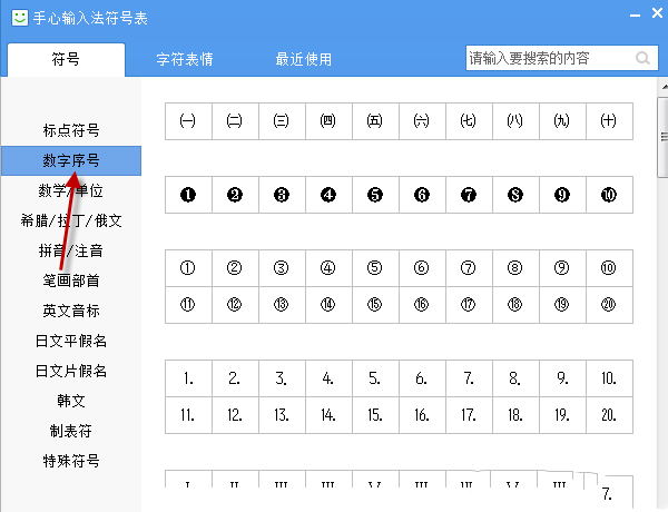 5、这里我们点击”数字符号“、”特殊符号“,可以看到每个类别下面有很多符号
