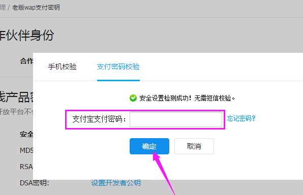 7、选择支付密码校验,输入支付密码,点击【确定】,验证正确即可获得MD5密钥。若不知道支付密码,可以选择短信验证。