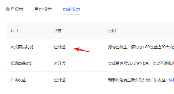 2、进入“功能权益”界面,查看图文商品功能的状态,点击“申请”进行审核。我这已经开通了。