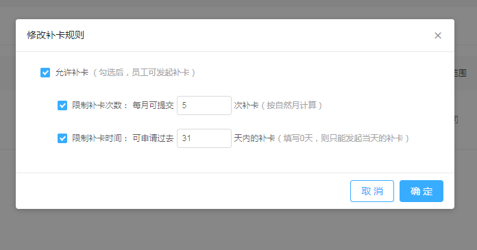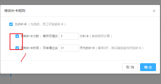 6、分别勾选上限制补卡次数、限制补卡时间,可以设置允许在多少天内发起发补卡,并且只能补卡多少次,否则将无限制。具体可以根据公司的规章制度来设置。