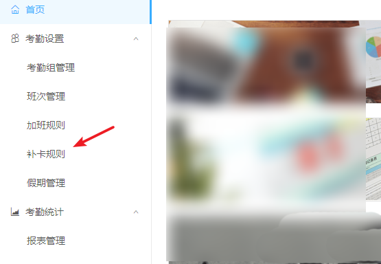 2、进入考勤打卡管理界面,在左侧的菜单中点击【补卡规则】