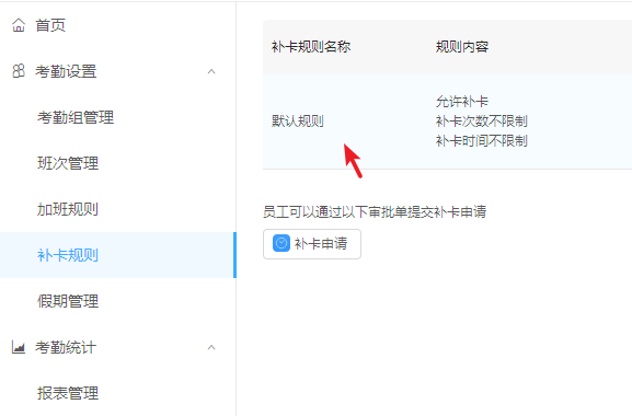 3、补卡规则只有一个,无法使用新建等功能,只可以对默认的规则进行编辑。