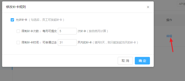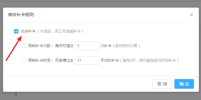 5、勾选上“允许补卡”,开通补卡功能,不然就无法补卡。