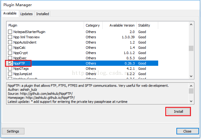 点击上图的"Show Plugin Manager"之后,会弹出一个对话框,如下图所示。我们找到"NppFTP"并勾选上前面的复选框,然后点击"install"进行安装。