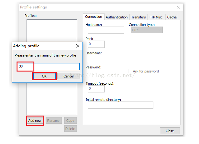 我们点击上图的"Profile settings"之后会弹出一个对话框,如下图所示,我们点击"Add new"按钮,点击之后又弹出一个小窗口,让我们起个名字,我们一般以要连的服务器的IP地址的最后一段为名字(比如,我要连的服务器IP是169.254.254.30,因此我输入的名字就是30),这样一看就知道连的是哪台服务器了。输完名字之后我们点击"OK"