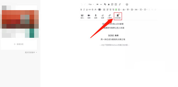 5、开通后,我们打开一篇写好的图文素材,或者新建也可以,在工具栏会出现“红包封面功能”,点击进入。如图所示