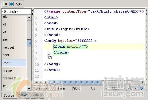 属性编辑器是动态的,光标移到不同的标签上,属性编辑器就显示这个标签所有可设置的属性。如上图中对应的是HTML 表单标签的属性编辑器,我们将其action属性设置为switch.jsp,指定用POST方式发送请求数据。
